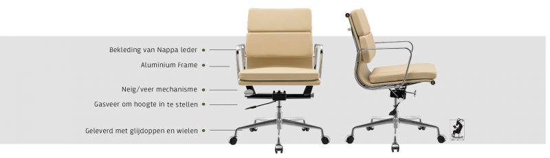 De softpad bureaustoel EA217 van Eames lijkt in erg op de aluminium group, maar onderscheid zich toch door het extra comfort. Met deze premium versie in de kleur Martica Cream, schaft u een nog comfortabelere en luxere variant aan. Met deze uitvoering geniet u van luxer leer, beter comfort en kwalitatievere materiaal keuze. De hoogte van deze stoel is met 1,5 cm verhoogd t.o.v onze andere modellen. Op deze manier kan ook een langere gebruiker comfortabel plaatsnemen op de bureaustoel. De kussens zijn bekleed met luxe nappa leder, wat heerlijk soepel en kwalitatief oogt en aanvoelt. Ook de gasveer hendel en neig/veer hendel zijn aangepast. Door de gasveerhendel van kunststof te maken, is deze minder krasgevoelig. De neig/veer hendel is gemaakt van aluminium, waardoor deze steviger is. De wielen van de bureaustoel zijn ook gemaakt van aluminium en afgewerkt met een hoogglans look.