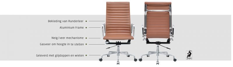 De keuze voor deze bureaustoel is gevallen op een hoge rugleuning van kwalitatief runderleer, afkomstig uit California. Wij hebben op voorhand een prachtige selectie gemaakt van dit model, waarbij u kunt kiezen uit wit, cognac, tan en zwart leer. Het leer, wat grof van textuur is, gaat niet alleen lang mee, maar smelt ook ontzettend mooi samen met het verchroomde aluminium frame. Onder deze hooglans chromelaag ligt een stevig stalen frame. Het zitcomfort voelt hierdoor luxe, stabiel en comfortabel aan. Met een hoge rugleuning, krijgt ook uw bovenlichaam voldoende steun en behoud u een betere werkhouding. U ervaart dus met deze replica echt een gevoel van comfort en luxe.
