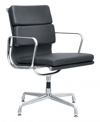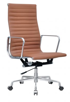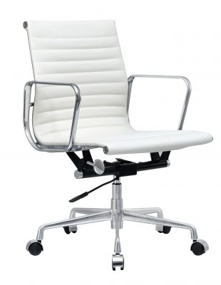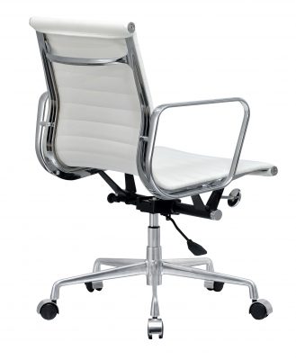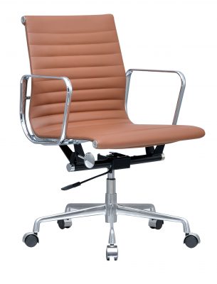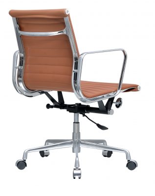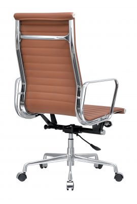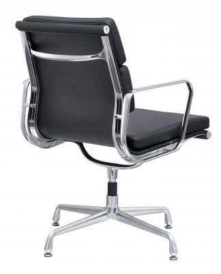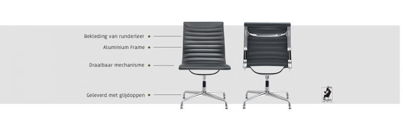 Voor het materiaal van deze replica is de keus gemaakt voor kwalitatief runderleer. Deze soort is afkomstig uit California, en is met stijlvolle stiksels over het zitvlak gespannen. De grove textuur van het leer is niet alleen onderhoudsvriendelijk, maar geeft ook een mooi contrast met het verchroomde frame. Onder deze hooglans chromelaag ligt een stevig stalen frame. Het zitcomfort voelt hierdoor luxe, stabiel en comfortabel aan en laat u als gebruiker genieten van deze prachtige bureaustoel.