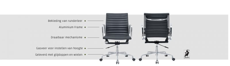 Voor het materiaal van deze replica is de keus gemaakt voor kwalitatief runderleer, afkomstig uit California, wat met stijlvolle stiksels over het zitvlak is gespannen. De grove textuur van het leer is niet alleen onderhoudsvriendelijk, maar geeft ook een mooi contrast met het verchroomde frame. Onder deze hooglans chromelaag ligt een stevig stalen frame. Het zitcomfort voelt hierdoor luxe, stabiel en comfortabel aan en laat u als gebruiker genieten van deze prachtige bureaustoel. Wij hebben voor u alvast een mooie selectie van uitvoeringen gemaakt, waarbij u de keuze heeft uit wit, zwart of cognac gekleurd leer. Daarnaast wordt de stoel ook aangeboden als hoog model.