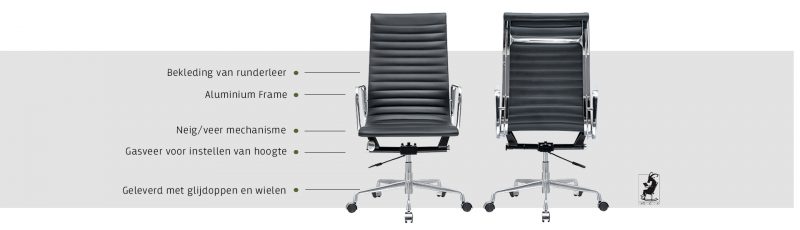 Voor deze bureaustoel is gekozen voor een hoge zitting van kwalitatief runderleer, afkomstig uit California. Uit onze selectie kunt u kiezen tussen wit, cognac en zwart leer. Het leer, wat grof van textuur is, gaat niet alleen lang mee, maar geeft ook een mooi contrast met het verchroomde frame. Onder deze hooglans chromelaag ligt een stevig stalen frame. Het zitcomfort voelt hierdoor luxe, stabiel en comfortabel aan. Met een hoge rugleuning, krijgt ook uw bovenlichaam voldoende steun en behoud u een betere werkhouding. U ervaart dus met deze replica een gevoel van comfort en luxe.