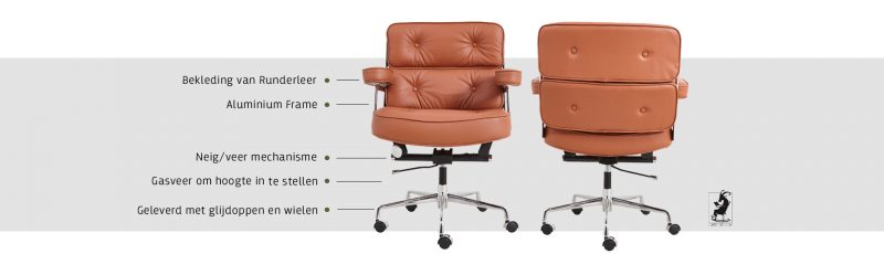 De lobby Chair van Charles & Ray Eames lijkt qua comfort en vorm erg op de Lounge Chair van ditzelfde designer duo. Met dezelfde brede zitting en comfort wat verdeeld is over 3 kussens, zit deze stoel ook fantastisch. Het ontwerp voor deze stoel is origineel gemaakt voor in de lobby van het ‘Time Life Building’ in New York. Vandaar ook de benaming die deze bureaustoel zo kenmerkt. Onze collectie biedt een replica van deze stoel aan in zwart, wit of cognac leer.