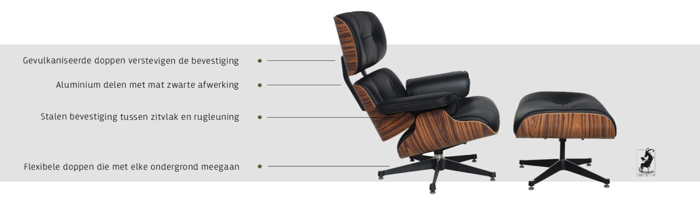Bij het samen stellen van deze stoel besteed Luiestoel.com veel zorg een aandacht aan het uitwerken van details en materiaal. De productie van deze Lounge Chair is in eigen beheer. Dat geeft ons de mogelijkheid om de beste uitvoering voor u te kunnen maken. In tegenstelling tot andere reproducties kunnen wij een optie aanbieden die een stuk sterker en kwalitatiever is. Ook kunnen wij alle onderdelen los aanbieden.