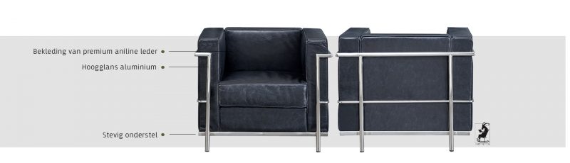 Je herkent deze stoel van Le Corbusier meteen door het opvallende frame. Dit aluminium, hoogglas verchroomde frame zit om de sofa heen en lijst de kussens in. Hierdoor blijft alles op zijn plaats en krijgt de stoel een prachtige moderne look. Bij het originele design kon men kiezen voor een toplaag van schuim of van veren. Met schuim bleef de leren bekleding strak en netjes. Een vulling met veren liet de kussens iets meer inzakken. Onze uitvoering is gevuld met schuim.