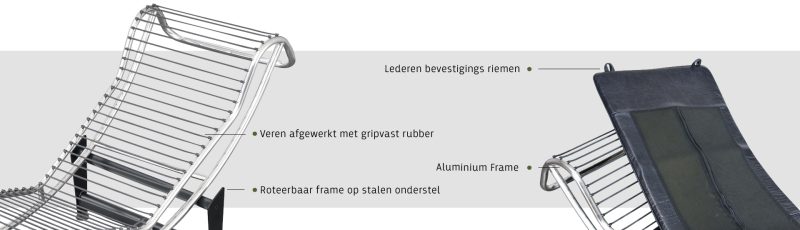 Het stevige metalen frame met zwarte afwerking ondersteunt het geheel. De vulling bestaat uit traagschuim, wat voor optimaal zitcomfort zorgt. Het matras rust op elastische banden die om het frame gespannen zijn. Het hoofdkussen is met leren riemen aan dit verchroomde frame bevestigd.